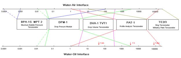 This method yields values for very long adsorption times (here up to about 10.000 s) however, for short times no data are provided by this technique. For a concentration up to 7×10-6 mol/l this time interval seems to be sufficient, for higher concentrations, however, the surface tensions at 5 seconds (the lowest time measured by the PAT-1M here, actually it can start from about 1 s), are significantly lowered due to adsorption. For such surfactant concentrations measurements at much shorter adsorption times are required. The only technique that provides data at adsorption times down to 1 ms and even less is the bubble pressure tensiometry (see BPA-1S and BPA-2S from SINTERFACE). For dynamic interfacial tensions short adsorption times like 1 ms are not accessible by any existing method. The following schematic gives an overview of existing methods for dynamic surface and interfacial tensions and the corresponding time windows. The drop pressure module (DPA-1 and ODBA-1) is the first experimental set-up which allows to measure at short adsorption times. Depending on experimental details, times even below 10 ms could be accessible.