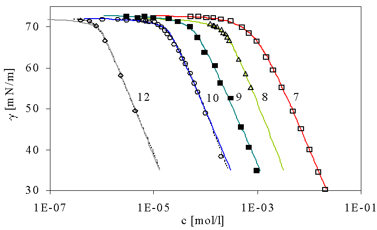 Ellipsometry is a possibility to measure directly the adsorption of surfactants at liquid interfaces. For pros and cons and range of applicability, please look into literature (H. Motschmann and R.Teppner, Ellipsometry, in “Novel Methods to Study Interfacial Layers”, Studies in Interface Science, Vol. 11, D. Möbius and R. Miller (Eds.), Elsevier, Amsterdam, 2001, p. 1). Easier accessible is the surface tension of a solution. Via thermodynamic models it is possible to determine the adsorbed amount from so-called surface tension – concentration isotherms g(c). The equivalent to the above Langmuir isotherm is the von Szyszkowski isotherm: