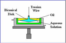 For surface layers the general set-up of the shear rheometer ISR-1 is shown in the schematic below. On the right side a special biconical disk is shown which is used for experiments at liquid-liquid interfaces.