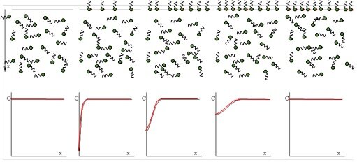 The adsorption process of surface active molecules at interfaces is a time process. When a fresh interface is formed, no molecules are adsorbed. Those close to the interface can adsorb first, creating a concentration gradient in the layer adjacent to the interface. Due to diffusion molecules move and re-establish a homogeneous distribution in the solution bulk. The schematic below shows the steps of such an adsorption process.