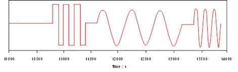 Using the dosing system the drop area can be subjected to transient or harmonic perturbations, such as those shown in the following graph: after 3 h keeping the drop surface area constant (10800 s) first 3 square pulses are performed, and then 3 oscillations each at 2 frequencies.