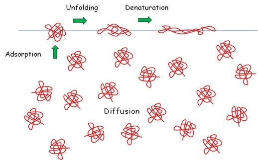 Also polymers, in particular protein, are surface active. As example the process of adsorption of a protein at the water-air interface is shown here. The protein is transported in the solution bulk by diffusion, arrives at the surface and adsorbs, and at the interface it is changing its conformation. The extent of this unfolding and denaturation process depends on the space available at the interface.