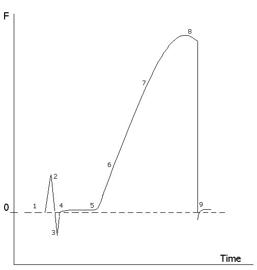 Fig. V.2 Schematic change of the force measured during the process of a ring tensiometer experiment After the position (4) is re-established, a subsequent measurement can be started. The force measured by the force transducer of the tensiometer changes in the way shown schematically in Fig. V.2. The given numbers refer to the various stages of the experiment. The software controls the ring movement (actually it is the dish containing the liquid that is moved while the ring is in rest) and determines the maximum weight of the formed meniscus.