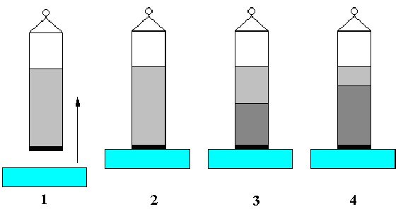 This method allows to measure the contact angle of disperse particles such as powders or fibres. A glass tube is filled with the material and closed with a porous lid. The filling procedure is extremely important to obtain reproducible results and depends on the material. The measurement is an automated procedure in the software of the TE 2/3. The principle steps of the experiment are shown in Fig. V.7. First the filled tube is hooked to the balance (1) and then brought into contact with the liquid (2). The liquid starts to wet the powder, hence the liquid meniscus rises inside the tube. After a transition period (3) a constant rising speed is reached, which later levels off and terminates (4). Fig. V.8 shows schematically the result of an experiment.